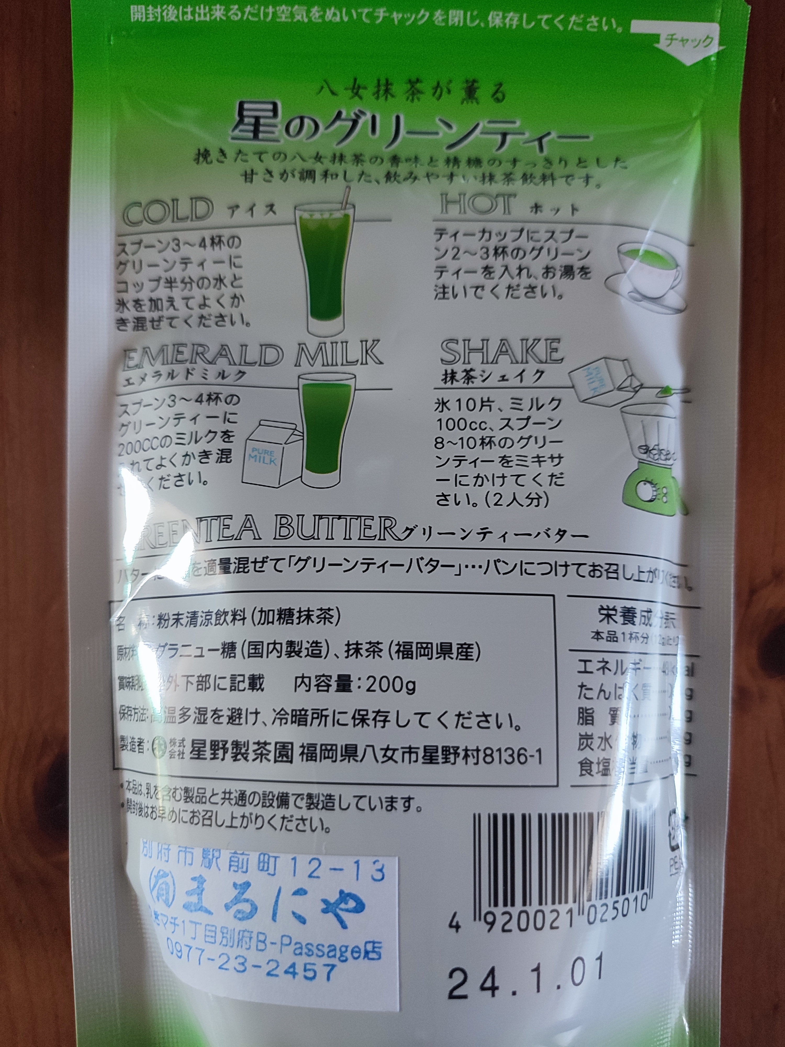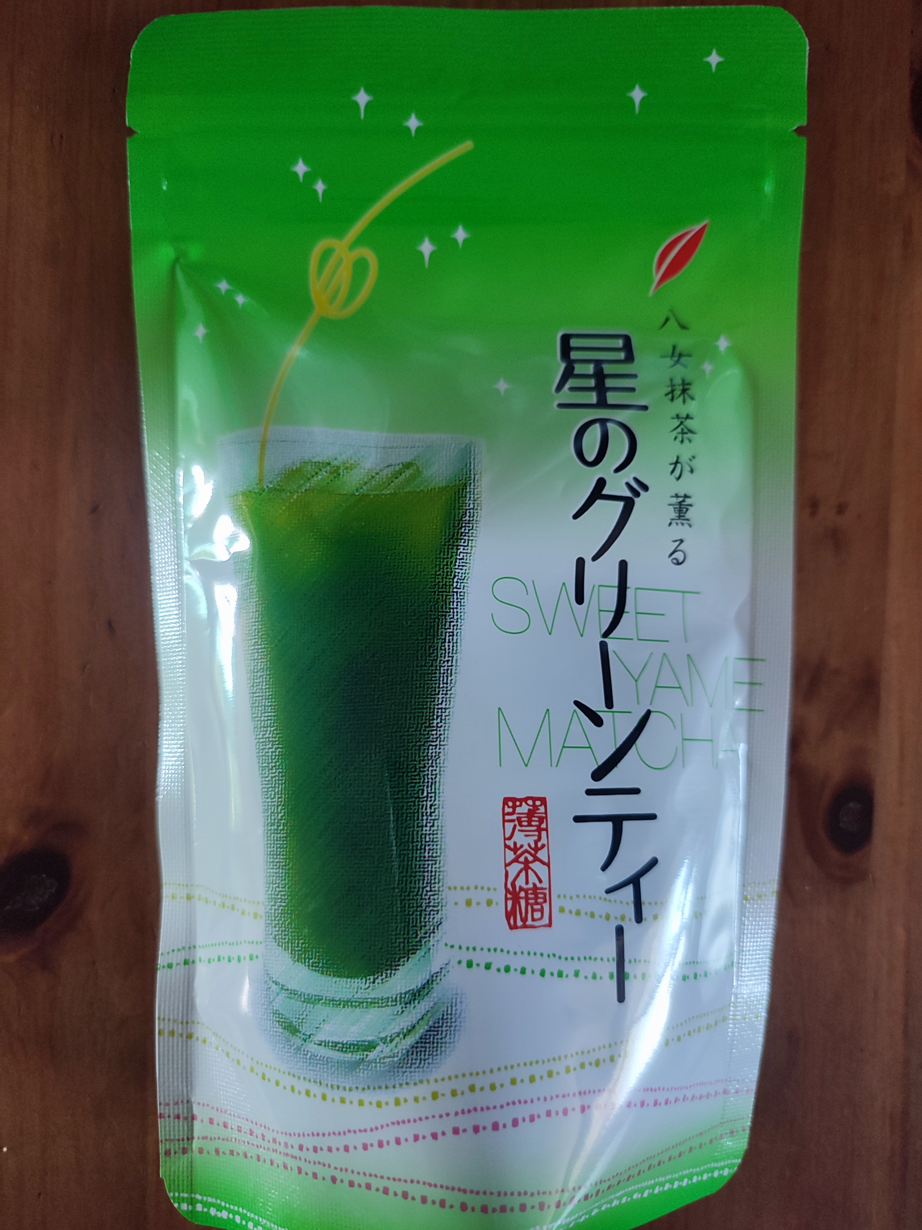 호시노엔의 별의 그린티입니다. 그린티(グリーンティー )라고 표기하면 대체적으로 설탕가루+말차인 경우가 많은데, 이 제품도 마찬가지로 그래뉴당+말차의 조합입니다. 후쿠오카 야메시 호시노무라(福岡県八女市星野村) 산 말차를 사용한 제품입니다.
