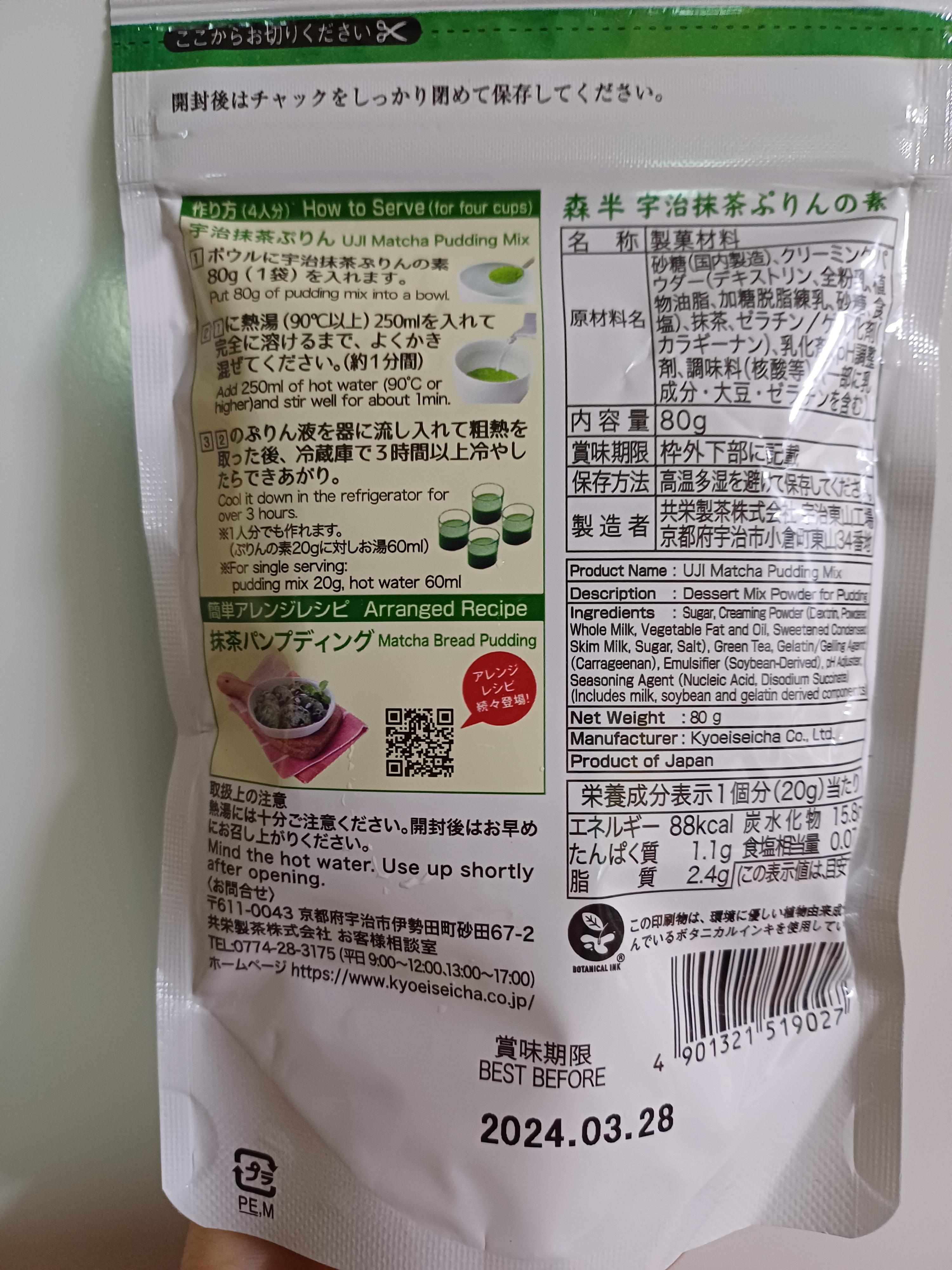 모리한에서 나온 우지말차를 사용한 푸딩믹스입니다. 참고로 제가 구입한 상품은 슈퍼마켓에서 판매하는 소매용이지만 온라인에서(공식홈, 라쿠텐 등등) 업무용 대용량(500g) 제품도 구입가능합니다. 이런저런 녹차가공품들과 함께 민튼 홍차도 취급하기 때문에 겸사겸사 한꺼번에 구매하기 좋습니다.