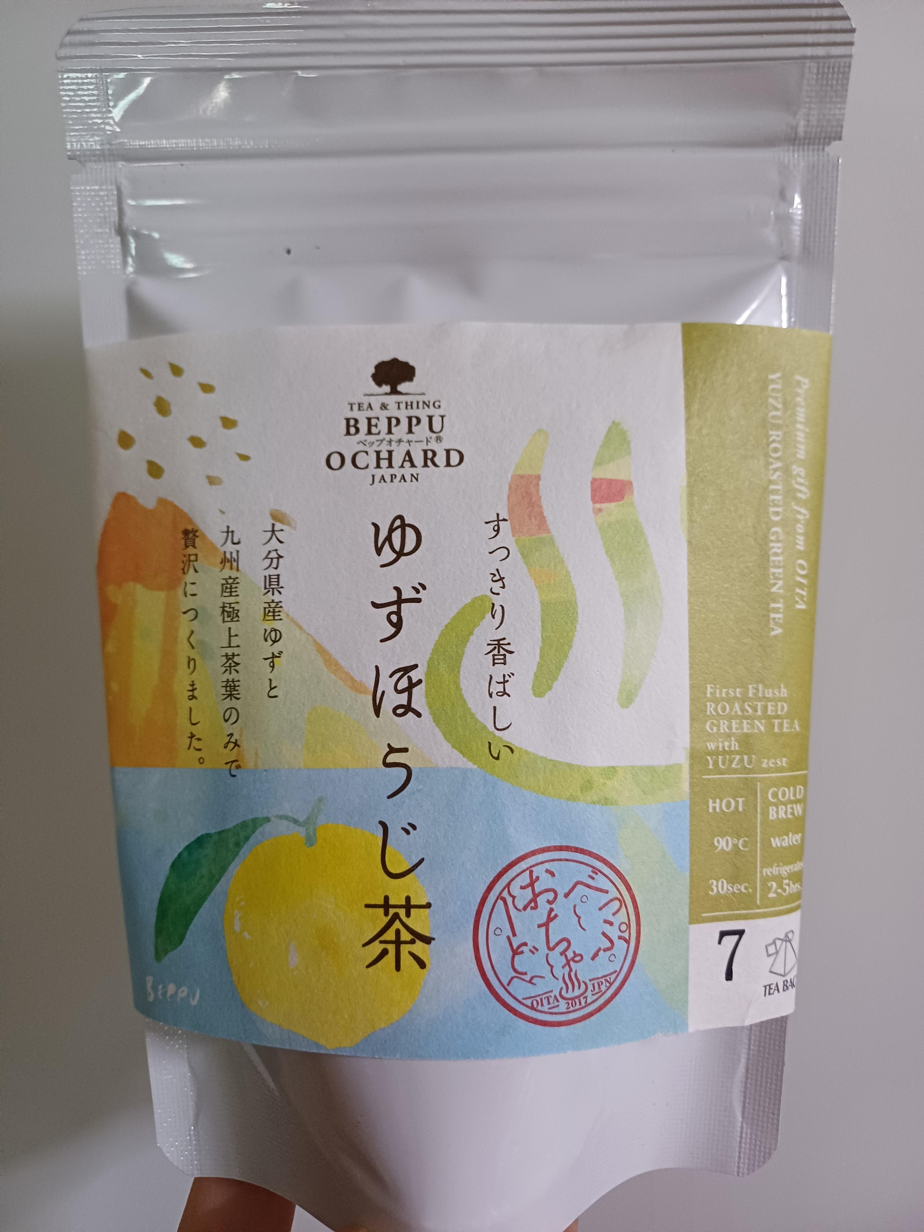 벳푸 오차드의 유자 호지차입니다. 로컬 재료를 사용한(오이타를 기준으로 넓게는 규슈 지역까지) 벳푸시의 관광 기념품으로 제조는 마루니야라고 하는 벳푸의 로컬 찻집에서 맡고 있습니다.