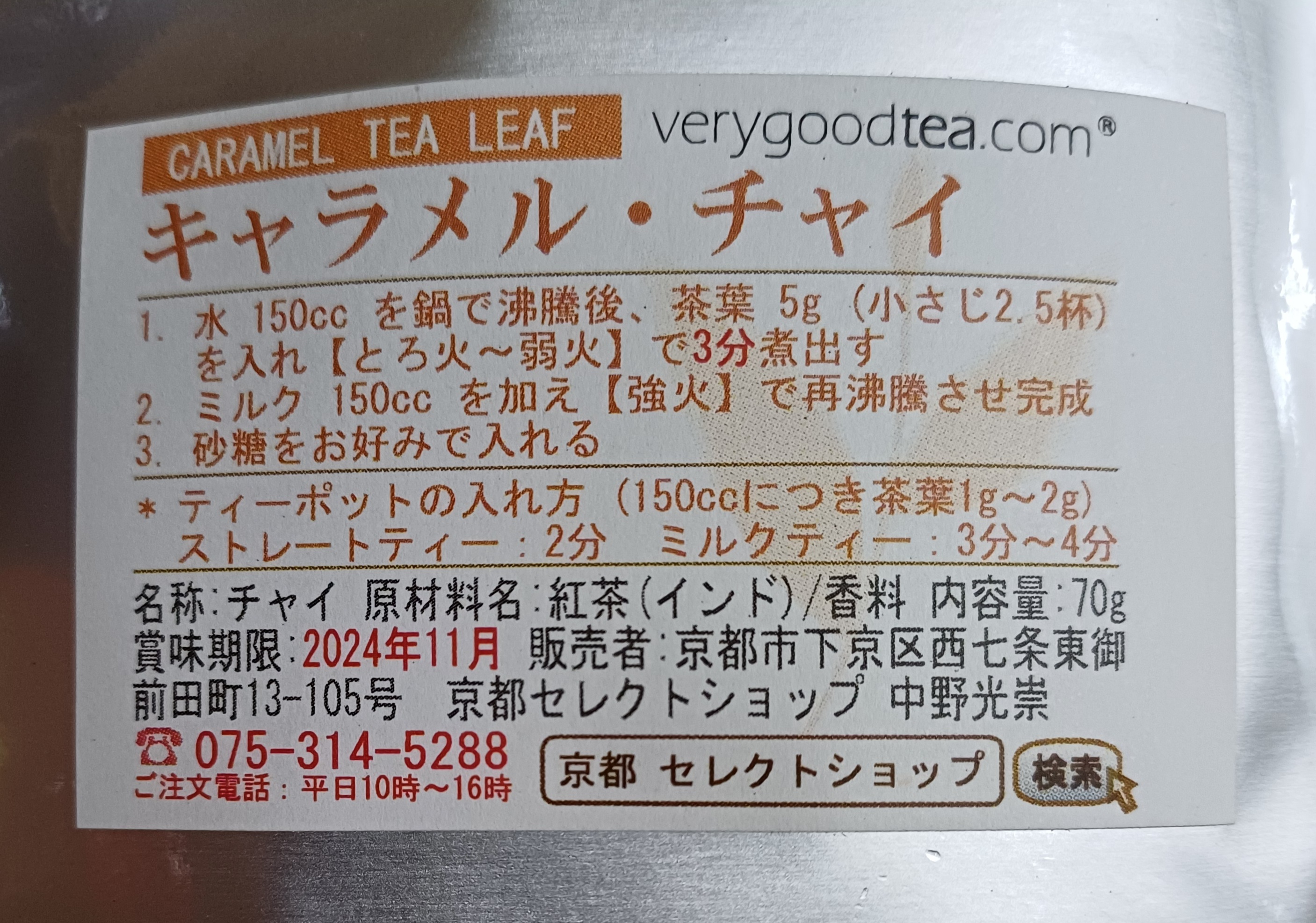 교토 셀렉트 숍의 캐러멜 차이입니다. 이름에 '차이(チャイ)'라는 단어가 붙어 있지만 향신료가 들어가는 녀석은 아닙니다. 실버팟처럼 로얄 밀크티용 찻잎이란 뜻으로 차이라는 단어를 쓰고 있습니다.