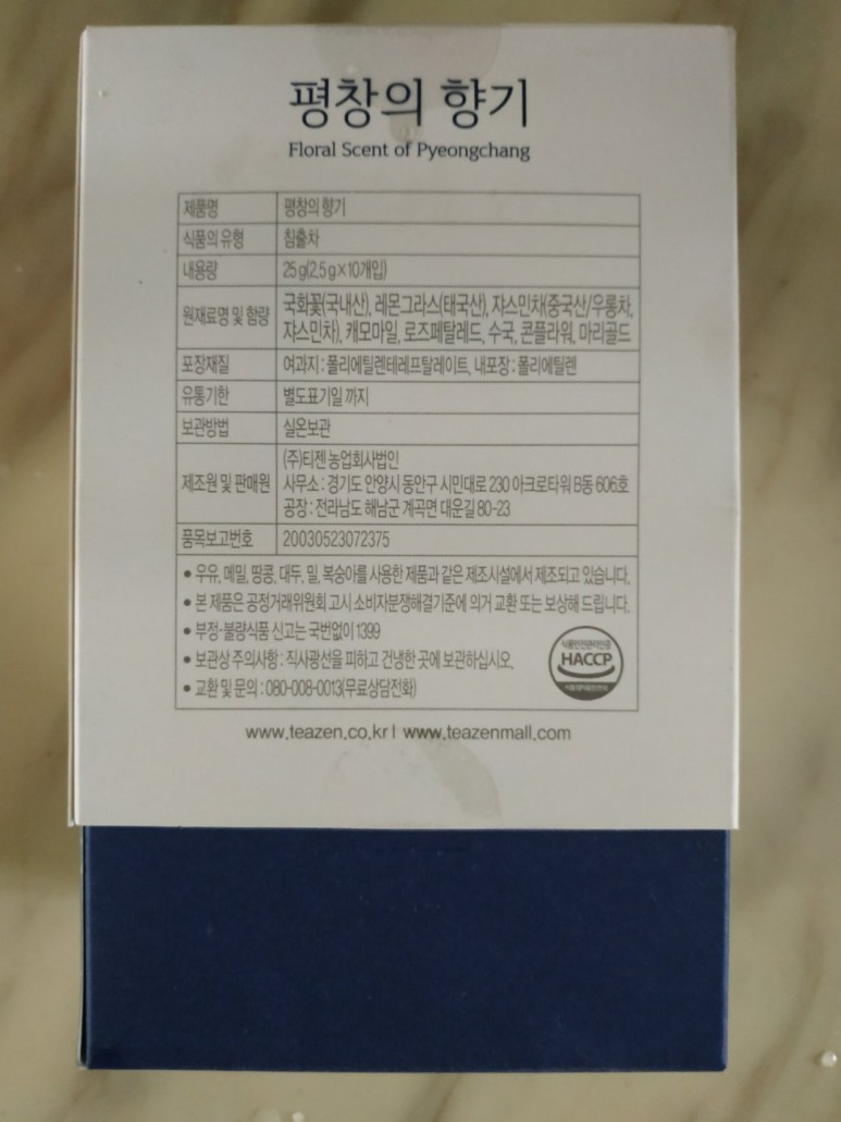 메인 베이스는 국화인 듯, 우롱차가 들어 있긴 하지만 존재감이 1도 없습니다. 무난한 꽃차 베이스에 수국차의 단맛과 레몬그라스에서 나오는 오묘한 신맛이 조금 섞여 있습니다. 블렌딩은 화려해서 예쁜데 맛은 뭐...... 단순한 조합인데다 반전이 없어서 시시합니다. 평창동계올림픽 기념차이지만 특별한 한정품이라기보다는 잘 팔릴만한 무난하고 안전한 블렌딩을 했다는 느낌입니다.