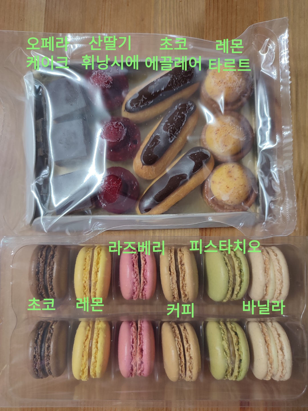 상자를 열어보면 마카롱과 쁘띠포 상자가 나옵니다. 개별 판매중인 마카롱과 쁘띠포를 합포장해서 프렌치 디저트 컬렉션이라는 이름으로 파는 것 같습니다. 구성은 1. 마카롱 : 초코, 레몬, 라즈베리, 커피, 피스타치오, 바닐라가 2개씩 총 12개, 2. 쁘띠포 : 오페라 케이크, 라즈베리 휘낭시에, 초코 에끌레어, 레몬 타르트가 3개씩, 총 12개입니다.