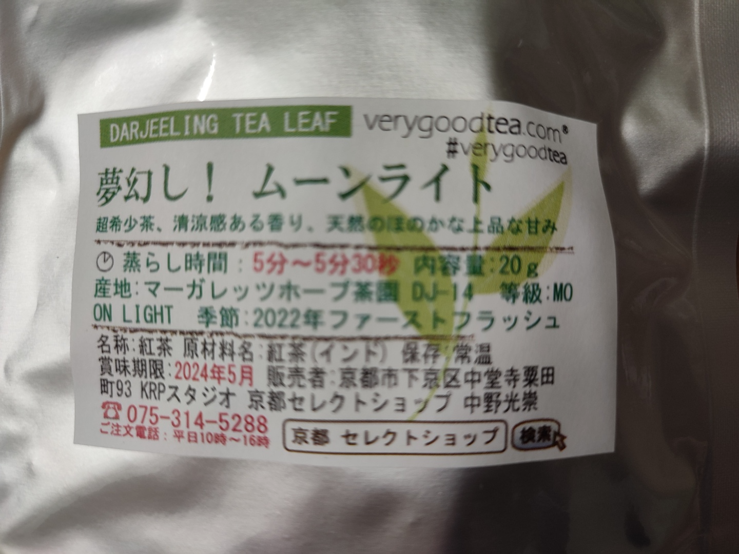 교토 셀렉트 숍의 마가렛 호프 DJ-14 2022 퍼스트 플러쉬 문라이트입니다. 20g, 2500엔, 이번에 교토 셀렉샵에서 구매한 다즐링 중에선 제일 고가입니다. 근데 요즘 다즐링이 워낙 비싼 데다 셀렉샵의 가격대가 다른 곳에 비해 낮아서 그런지 상대적으로 저렴하게 느껴집니다. (병마 때문에 다즐링을 몇 년 못 마신 호구는 셀렉샵보다 비싼 실버팟이랑 리풀도 질렀...)
