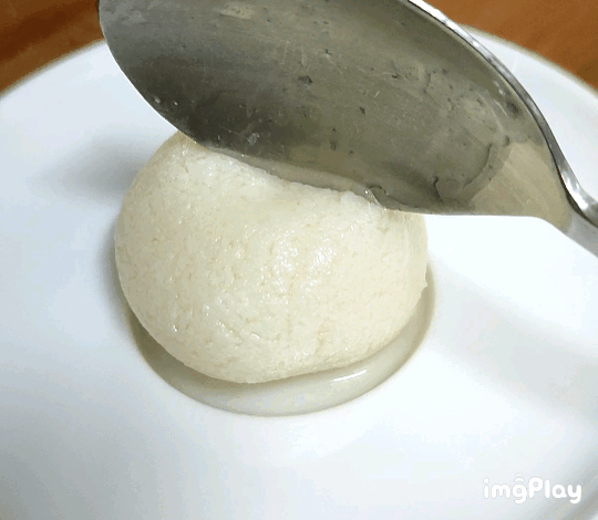 하룻밤 정도면 라스굴라가 물을 흡수해서 오동통하게 부풀어(?) 오릅니다. 이렇게 물을 흡수한 라스굴라는 스펀지 같은 특유의 식감이 제대로 살아납니다. 한 입 베어 물면 스펀지 같이 말랑말랑 촉촉하고 부드러운 느낌 + 작은 커드 알갱이 사이사이에 스며있던 달콤한 시럽이 흘러나오면서 달콤한 맛과 은근한 우유맛(커드, 코티지치즈맛)이 입안을 가득 채웁니다. 바스러지는 치즈 입자들 덕분에 입안 가득 고소한 우유맛이 퍼집니다. 스펀지 같은 식감과 작은 코티지치즈 알갱이가 입안에서 돌아다니는 것이(부드러운 모래 알갱이?) 한국 음식이나 디저트에선 찾기 힘든 매우 이질적인 느낌이라 호불호를 갈릴 수 있지만 개인적으로는 맛있게 먹었습니다. 당도 조절은 물양으로 하면 되는데 기본적으로 매우 달콤한 디저트이기 때문에 단맛을 별로 좋아하지 않는다면 물을 왕창 넣고 불리는 것을 추천합니다.