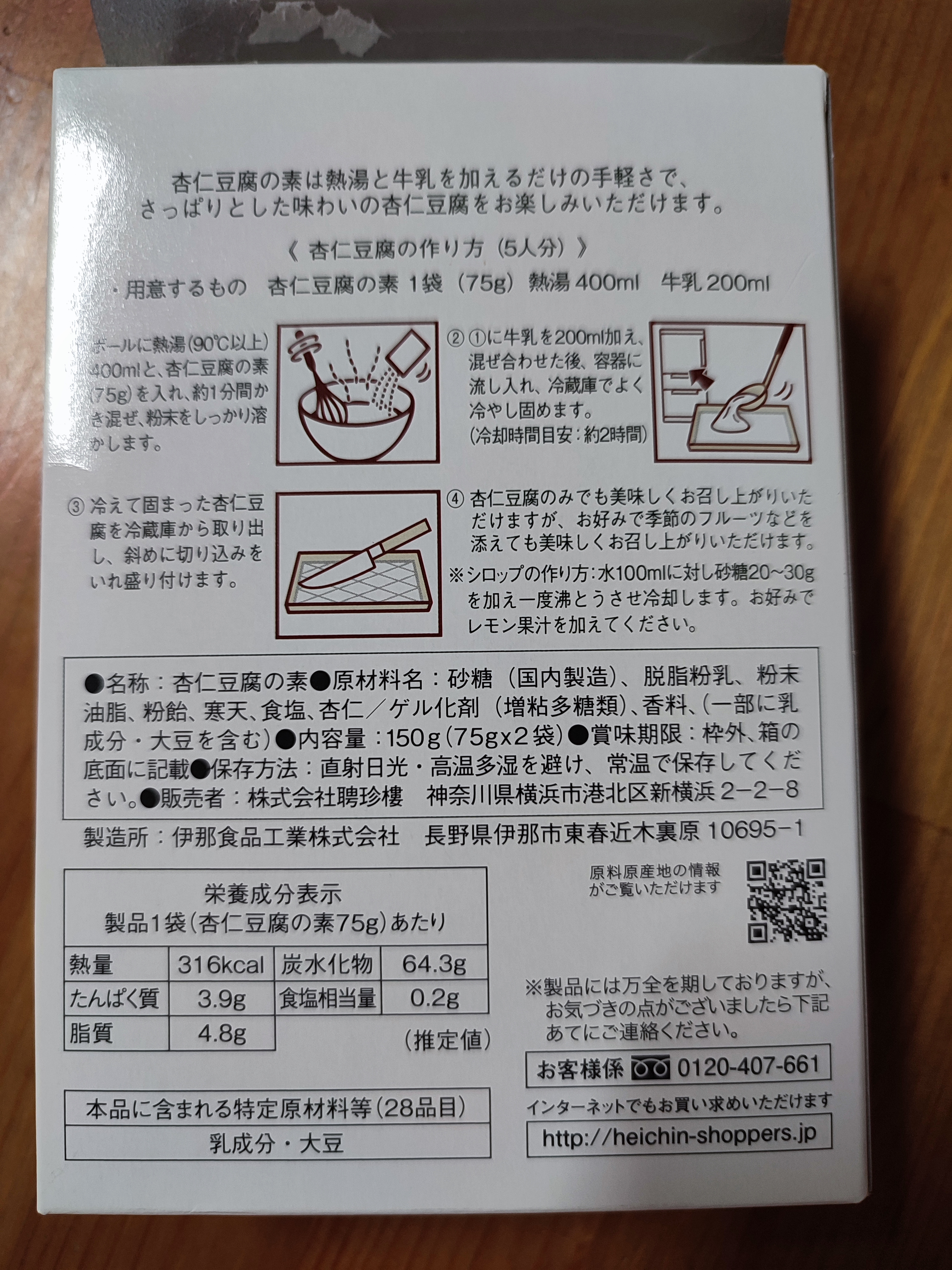 요코하마 차이나타운에 위치한 일본에서 가장 오래된 중화요리집 헤이친로우의 이름을 달고 나오는 안닌도후 믹스 파우더입니다. 유명 요리집 이름을 달고 나오는 만큼 밀양한천에서 나오는 믹스보단 맛납니다. 맛, 향, 당도, 질감, 굳기 다 좋습니다. 깔끔하고 향긋하면서 많이 달지 않은 맛이에요. 상자에 써진 조리법대로만 해도 맛난 안닌도후를 만들어 먹을 수 있습니다. 기본적으로 향과 간(..)이 진하게 들어간 제품이 아니라 액체 양을 너무 늘리면 이도저도 아닌 맛이 될 확률이 높습니다. 물과 우유의 양도 권장 조리법에서 크게 벗어나지 않는 걸 추천합니다. 물 대신 우유를 너무 많이 쓰면 우유맛만 너무 진해져서 별로더라고요.