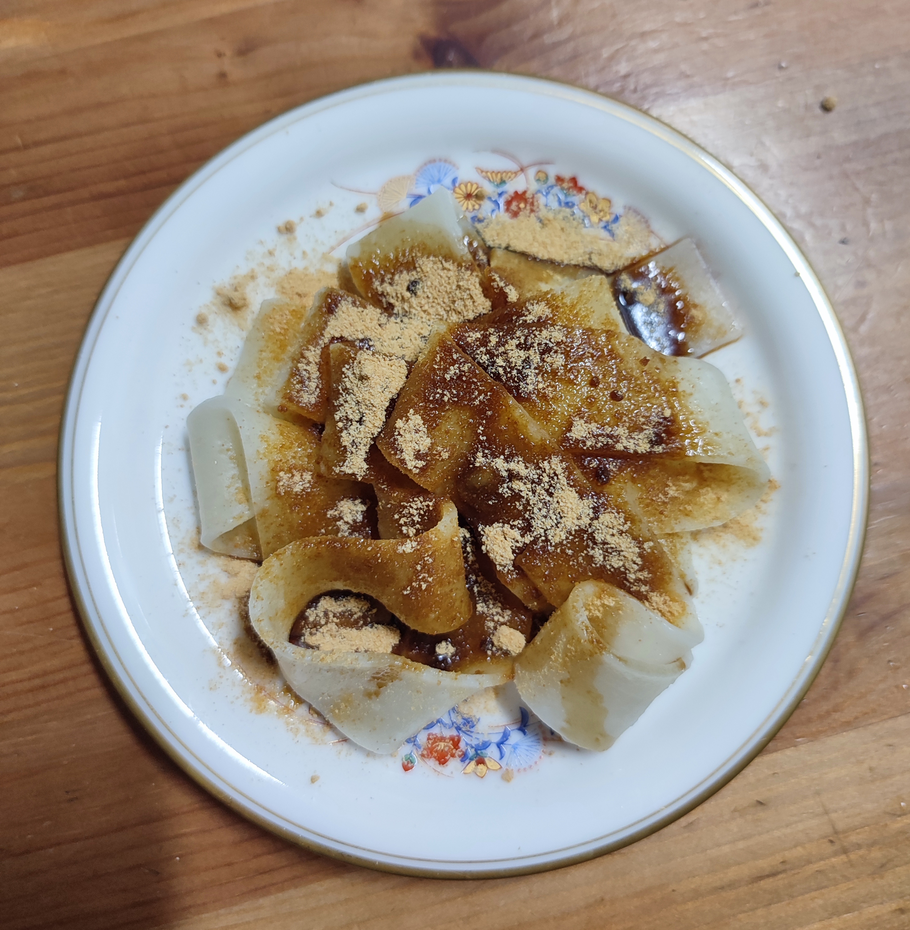 요똥이라도 확실한 결과물을 낼 수 있는 간단한 디저트입니다. 하지만 소박한 비주얼 + 매우 단순한 맛이기 때문에 특별한 무언가를 기대했다면 실망할 수도 있습니다. 미즈신겐모찌나 쿠즈키리는 비주얼이라도 특이하지(쿠즈키리는 그릇이 예쁘고 from 교토라는 태생 때문에 비쥬얼이 좋은 것 아닌가) 이건 그냥 국수에 흑설탕시럽이랑 콩가루 뿌려 놓은 모양새라 밀가루 반죽만 잘 만든다면 한국에서 파는 재료로도 구현할 수 있는 녀석이거든요.