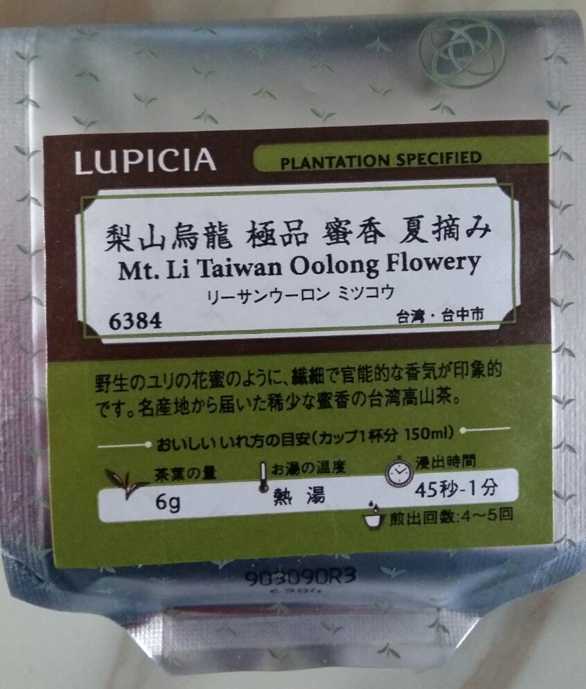 2017년 산 리산우롱 극품 밀향 여름 따기입니다. 특이점이라면 동방미인처럼 벌레가 갉아먹은 찻잎으로 만들었다고 합니다. 루피시아 측 설명을 보면 2017년도 해당 로트는 여름에 발생한 차벌레로 인해 우연히 생긴 생산품이라고 합니다. (良く晴れた夏の日に多くの努力と自然が生む偶然が重なり合う事で作られました。夏に多く発生するウンカという小さな虫が噛んだ茶葉を使用)